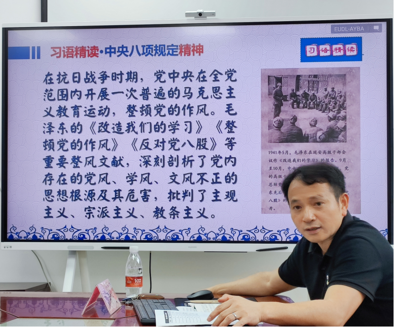 刘秦民结合习语精读·中央八项规定精神,以毛泽东同志《改造我们的学习》《整顿党的作风》等延安整风经典文献为切入点,从党的自我革命精神中提炼理论精髓,深刻溯源党的自我革命精神谱系,刘秦民指出:“从延安整风‘反对主观主义、宗派主义’到新时代八项规定‘抓铁有痕’的深化,体现的是共产党人一脉相承的刀刃向内的勇气。”刘秦民副院长通过解读“三大纪律六项注意”与中央八项规定精神的传承脉络,剖析“古田会议确立党指挥枪原则”对新时代纪律建设的启示,强调党的作风建设必须从毛主席提出的“不做寿、不送礼、少敬酒”等“六个不”优良传统中汲取养分。
