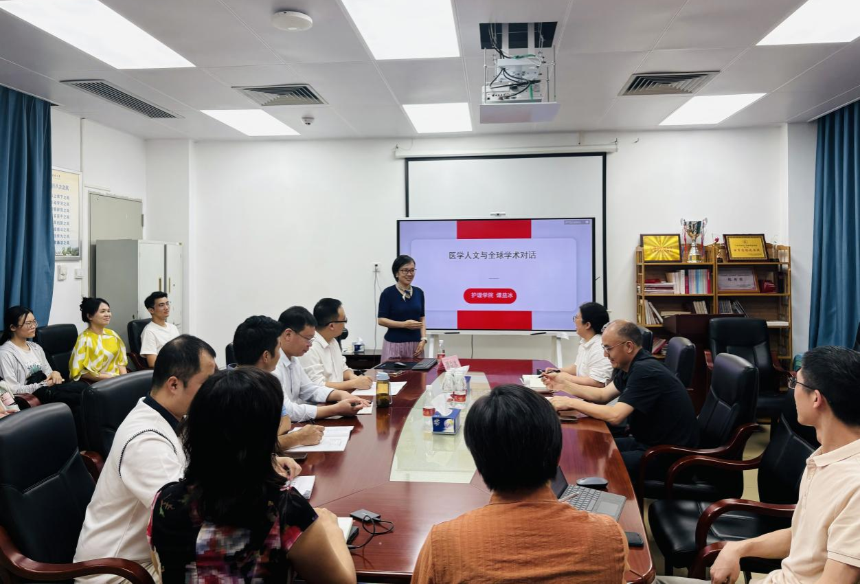 在全球化视野与学科交叉融合不断深化的今天,医学人文正成为推动医学创新与学术对话的重要纽带。如何将医学实践的人文关怀转化为具有国际影响力的学术成果?如何驾驭SSCI/SCI期刊的写作范式,让中国学者的声音融入全球知识图谱?为探索这些问题,437必赢会员中心于5月14日18:30在人文楼403举办“岐黄•博思”青年学术沙龙第五期活动,此次活动聚焦“医学人文与全球学术对话”,特邀护理学院谭益冰副院长从实战角度谈SSCI/SCI论文撰写与发表策略。437必赢会员中心党委书记龚建文、副院长曾庆娣和学院20余位师生参加,沙龙活动还吸引了部分其他学院师生参与,活动由龚建文书记主持。