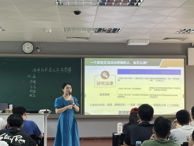 课程的核心环节聚焦医学信息工程专业特色。陈老师抛出一个贴近行业实际的真实案例:“某医院工程师盗卖患者数据侵犯隐私权与健康权,各方应如何应对?” 学生们被分成“患者组”、“涉事人员组”、“执法组”、“医院管理者组”及“旁听组”,围绕“法治思维是科学、逻辑、正当性、规范性思维”这一主题展开激烈讨论。学生们将医疗信息化中的隐私保护、电子病历数据合规使用等专业问题融入案例,使抽象的法治思维转化为未来职业必备的“刚需技能”,显著强化了法治思维在医疗信息化领域的实践意义。
