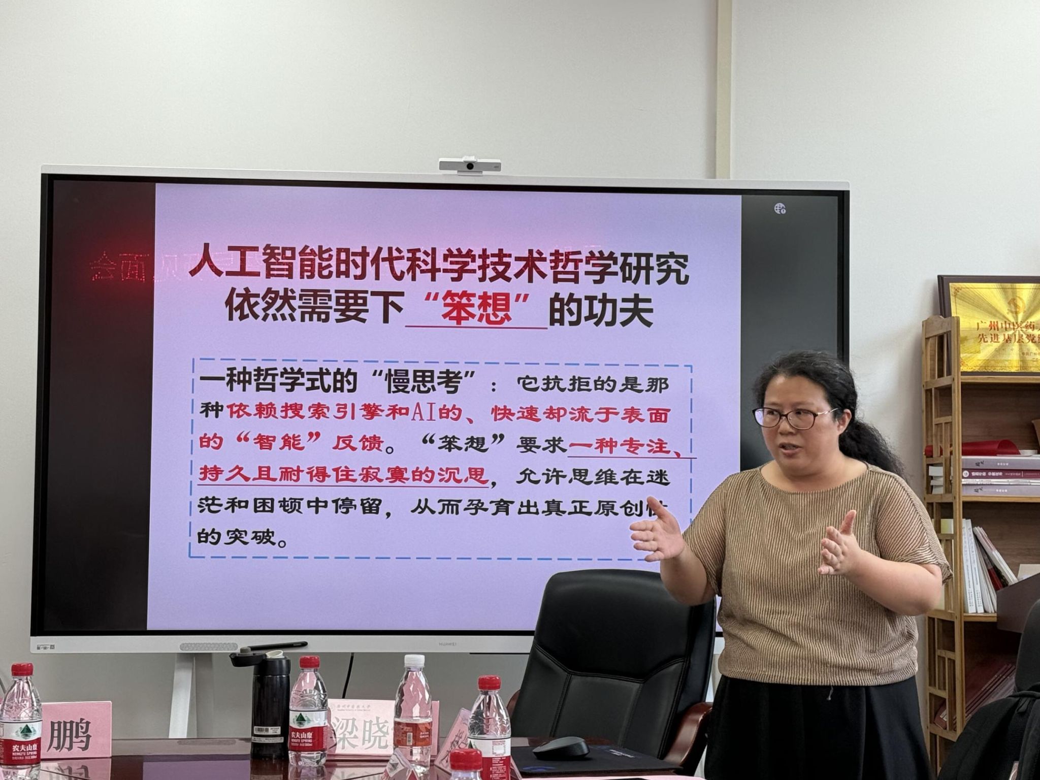 研究生教育分管领导曾庆娣副院长随后以“人工智能时代科学技术哲学研究依然需要下‘笨想’功夫”为主题,通过引入与AI对话“您能替代人类思考吗”,揭示了人工智能在辅助科研中的工具性边界。她指出,AI虽可承担信息检索、逻辑初构等程序性工作,但其缺乏真正的理解力、价值判断与批判反思能力,无法替代人类特有的理论思维。她进一步强调,在科技哲学研究中,研究生要回归哲学传统的“笨想”功夫,通过专注、持久且耐得住寂寞的沉思,锤炼提出真问题的能力、构建理论框架的想象力以及对技术时代的哲学反思力。