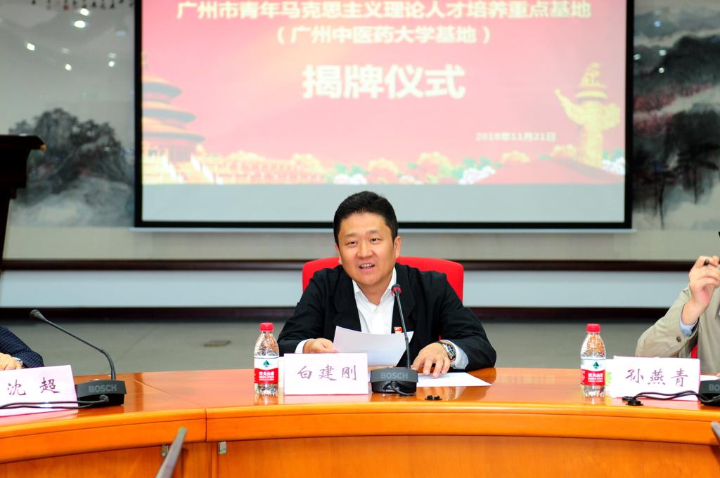 学校党委白建刚副书记、广州市社科联科研规划部沈超同志分别致辞。白建刚副书记在讲话中指出:我们要按照广州市委宣传部的要求,凝心聚力,守正创新,结合学校的特色完成基地建设的各项任务,努力开创我校对内抓牢思政教育根本、对外彰显中医药文化特色的思想政治工作新局面。