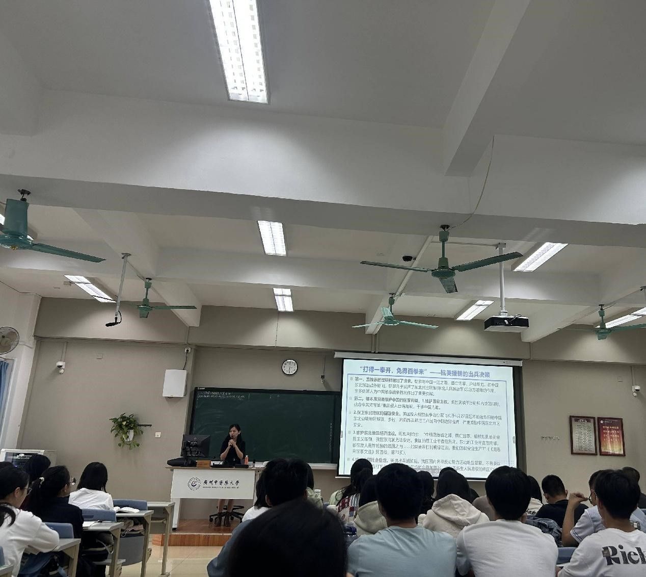 曾云珍老师运用唯物史观讲授新生人民政权是如何巩固的,基于中国人民站立起来了、新中国成立初期面临的考验以及捍卫巩固新政权的斗争三方面进行分析,理论联系实际,层层推进,重点突出,并辅之以多媒体技术,多方位多层次启发同学深层思考。课后同事们就教案设计、多媒体技术运用、学生主体性激发等方面进行了深入交流。此次公开课活动为学院教师提供了相互学习的平台,有利于提升学院教学质量。