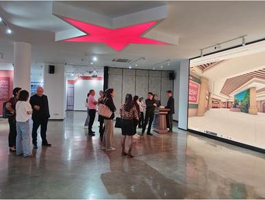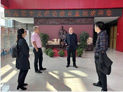 座谈会结束,与会人员参观了温州大学马克思主义理论教育基地,沉浸式体验新形态教学成果。双方就党建思政教育基地和虚拟仿真教学场馆建设、板块布局、实践形式等方面进行了具体的讨论,为我校融合思政课教学搭建党建思政教育基地提供了建设思路。