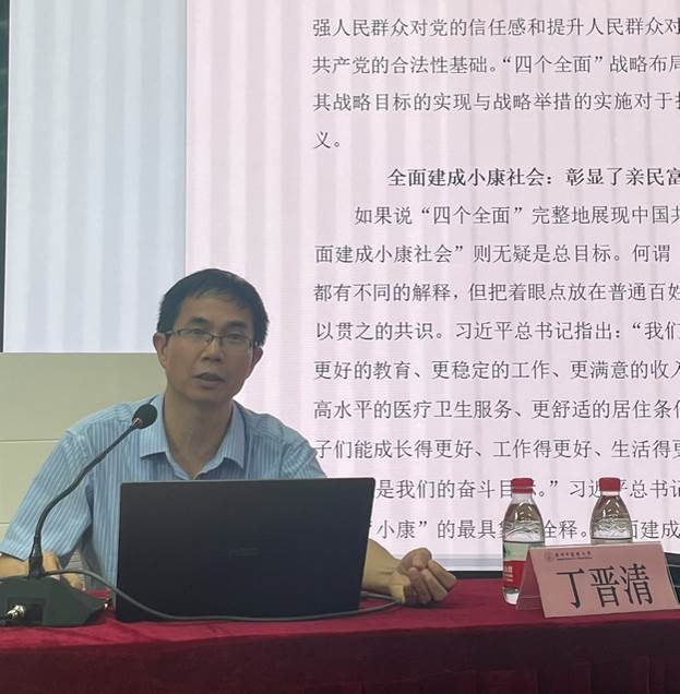 讲座伊始,龚建文书记简要介绍丁晋清教授的学术背景以及讲座的主要内容。其后丁晋清教授结合自身的写作经验和具体范例,详细阐释了自己在《人民日报》《光明日报》《经济日报》和《求是》杂志(简称“三报一刊”)发表多篇理论文章的撰写过程和经验。他从所发文章的时代背景、选题立意、创新之处、写作技巧和职责使命等多方面进行了详细的讲解。