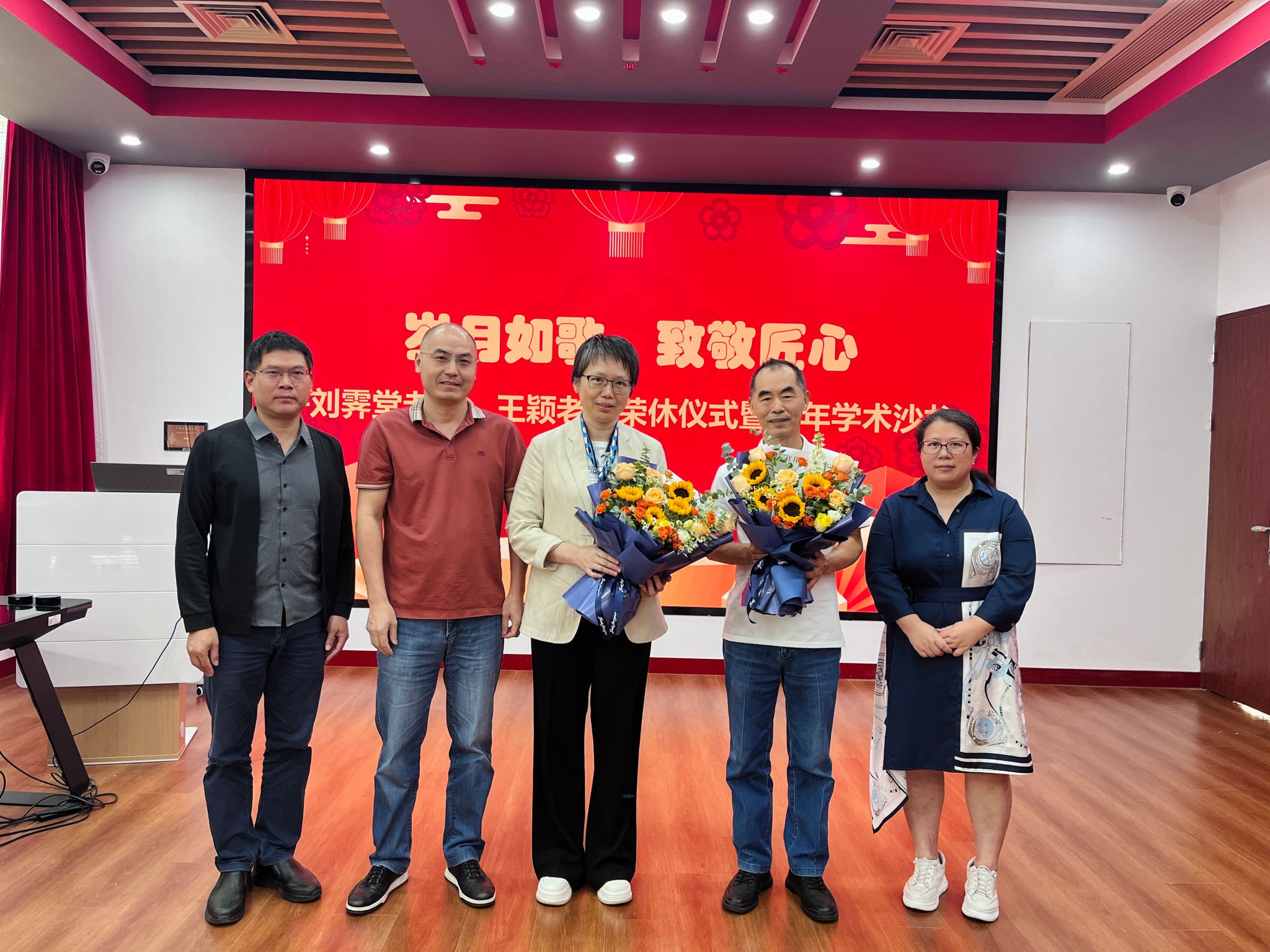 龚建文书记为荣休教师颁发荣休纪念品和献花。他代表学院向荣休教师致以诚挚的问候,并感谢他们为国家教育事业、为学校、学院发展的辛勤付出。