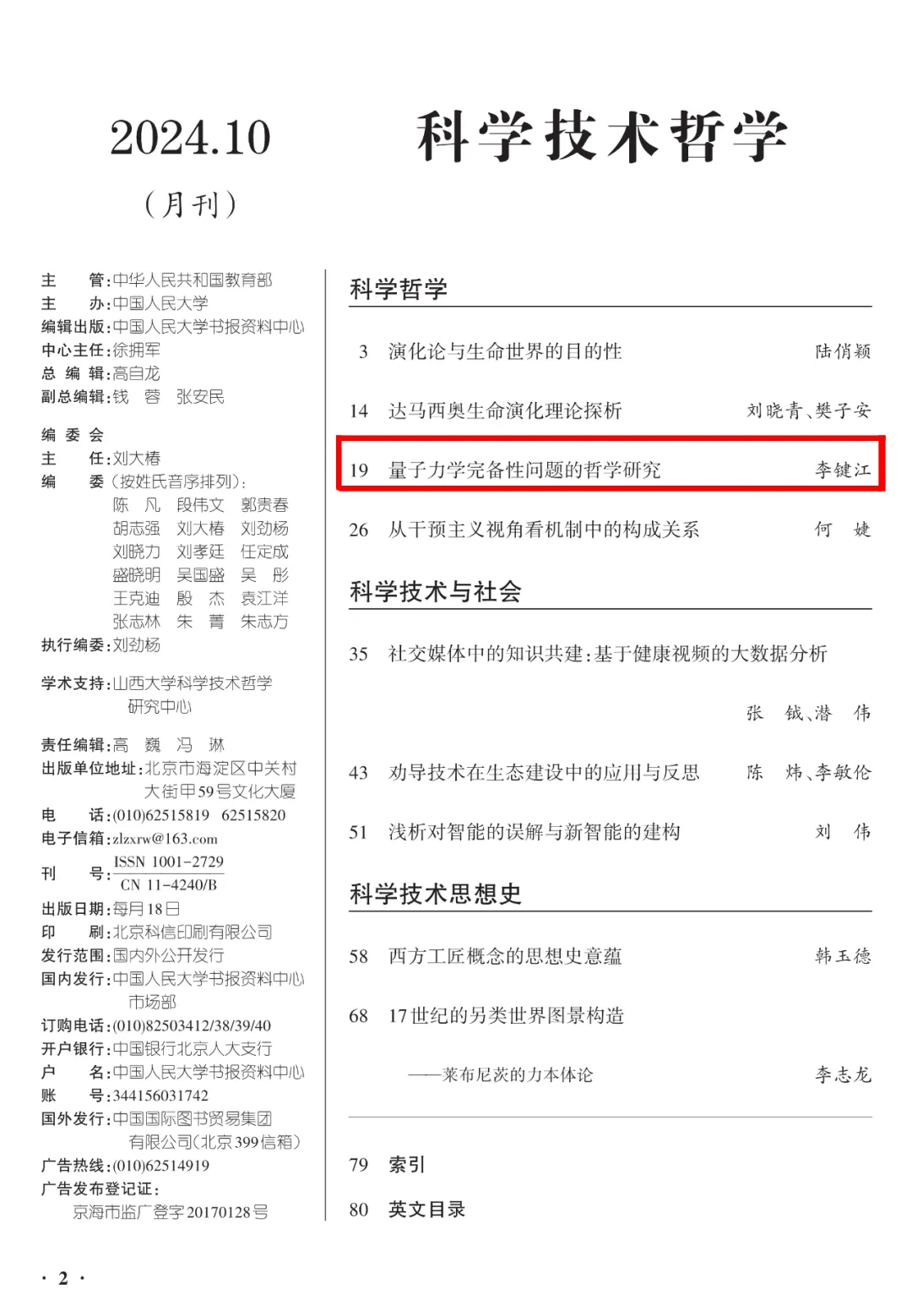 近日,我院教师李键江发表的学术论文《量子力学完备性问题的哲学研究》被中国人民大学复印报刊资料《科学技术哲学》2024年第10期全文转载。该论文原发表于《武汉科技大学学报(社会科学版)》2024年第2期。