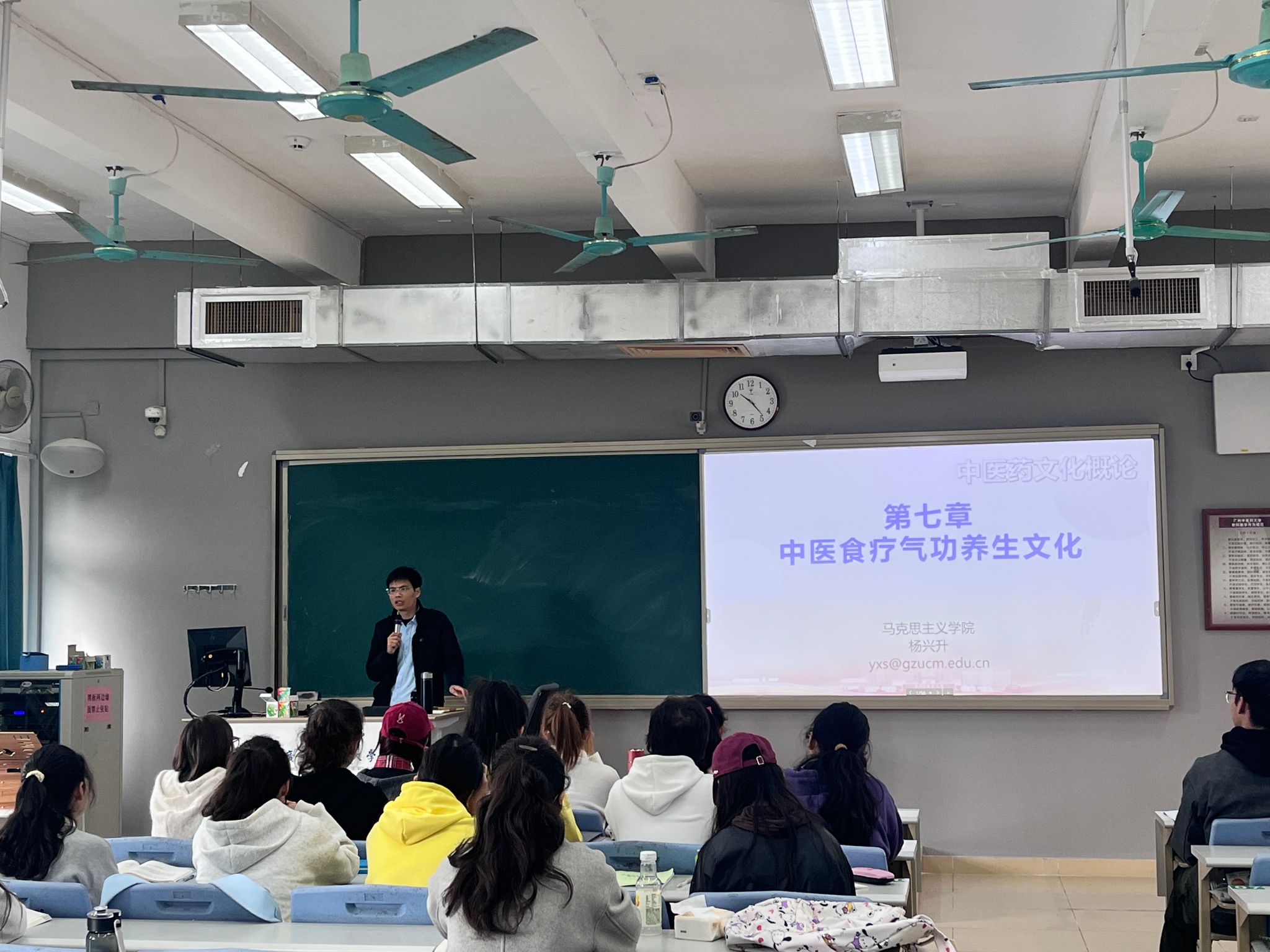 杨兴升老师通过日常生活的饮食例子和问题激发了同学们对于中医药养生实践的讨论与兴趣,继而引出了中医药文化的课程内容。杨老师从“药食同源之说”“饮食医疗养生观念的形成和发展”两方面展开了“中医食疗养生观念”的内容,用生动的现实生活案例讲解了“药从食出”“药食同进”的历史进程及其背后的道理。课后同事们进行教学的深入交流。