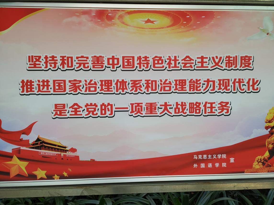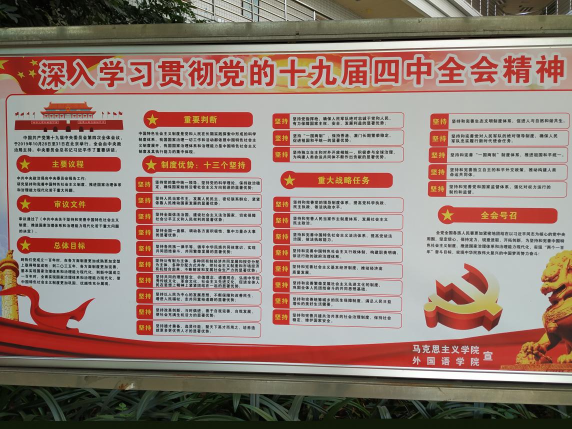 为广泛宣传党的十九届四中全会精神,437必赢会员中心制作了两张精美海报张贴于人文楼一楼大厅,海报详细介绍了十九届四中全会的主要议程、会议审议文件、一个总体目标、一个重要判断、十三个坚持、今后的重大战略任务和全会号召。