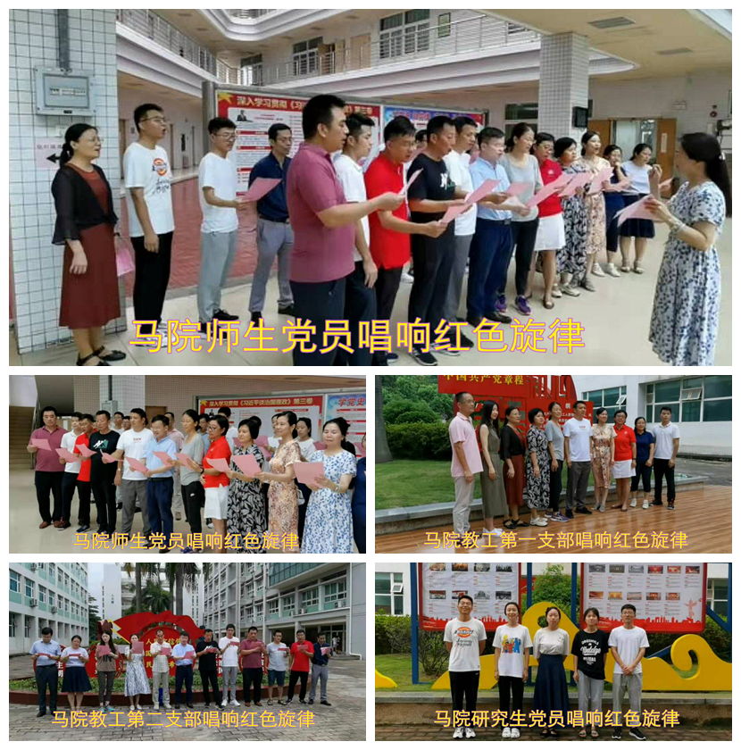 马院党总支积极响应校党委号召,在人文楼下、在思政广场上,通过唱响红色旋律向党的百年华诞献礼,表达对党的深厚情感。学院教工第一支部用振奋的歌声唱响《学习雷锋好榜样》,教工第二支部《歌唱祖国》的旋律铿锵有力,学生支部《团结就是力量》彰显了年轻学习的活力。最后,学院全体师生党员高唱《没有共产党就没有新中国》。大家表示:唱响红色旋律,直抒胸臆,歌颂党,心向党,是马院给党生日充满深情的礼物!