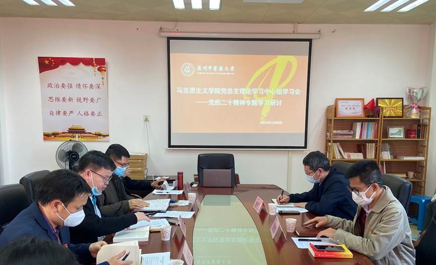 2022年12月8日上午,学院党总支理论学习中心组召开学习会,专题学习研讨党的二十大精神。会议由学院党总支书记陈霖主持,学校党委宣传部部长郑维群、党委办公室副主任谢莺燕列席,理论学习中心组成员参会。