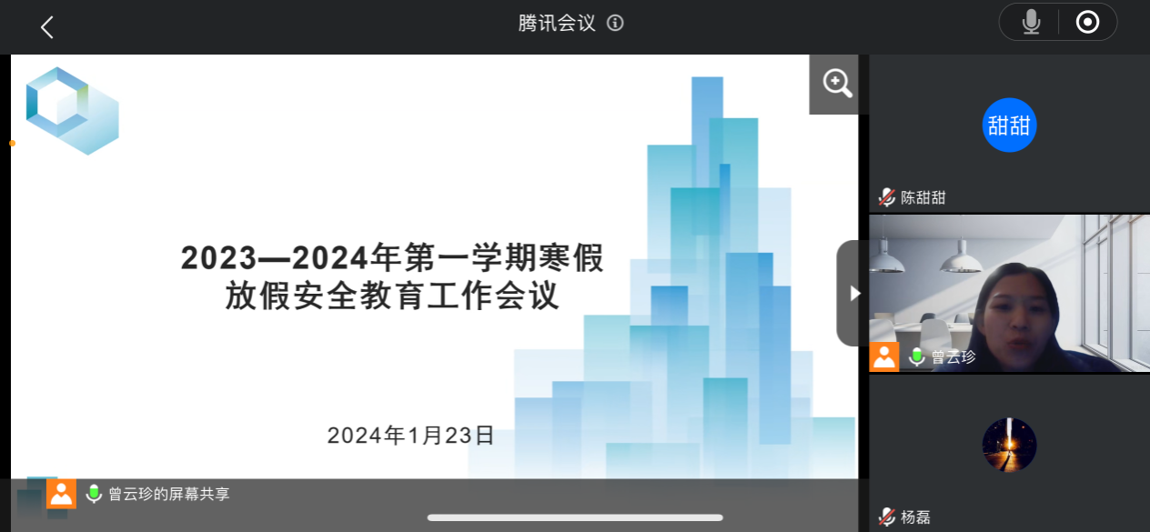 2024年1月21日晚上,2022级研究生召开线上寒期安全教育管理会议,本次会议由辅导员谭志敏老师主持,22级全体研究生参加会议。会议伊始,谭老师从安全教育入手,对政治安全、意识形态安全、公共卫生安全、交通安全、消防安全、实验室安全、宿舍安全、财物安全、防盗防骗防传销防溺水、防人身侵害等方面开展宣传教育,引导研究生增强自我保护意识和安全防范意识。随后,谭老师与留校研究生沟通走访时间,并嘱咐研究生结合导师建议,安排好假期学习与生活,并祝同学们假期愉快。