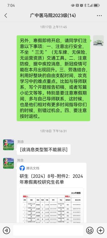 2024年1月17日上午,2023级辅导员严云山老师在班级群里从出行安全教育入手,嘱咐同学们不坐“三无”(无车牌、无保险、无运营资质)交通工具。提醒同学们注意防疫,据中疾控消息,新冠疫情可能在本月出现回升。叮嘱同学们要劳逸结合,利用好寒假时间,攻克学习中的难点重点,为将来的学术研究打下扎实的基础。